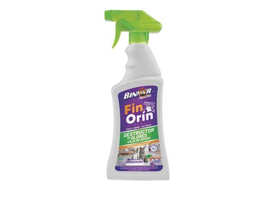 Destructor de olores Fin Orín de 700 ml con fórmula enzimática avanzada específica para cajas de arena de gatos. Elimina los olores de orina y desechos desde la fuente, manteniendo un ambiente fresco y prolongando la vida útil de la arena. Fórmula segura y concentrada de marca colombiana Binner Mascotas.