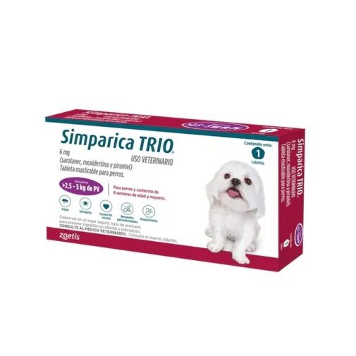 Simparica Trio para perros de 2.5 a 5 kg es una tableta masticable de 6 mg con triple acción antiparasitaria. Combate pulgas, garrapatas, ácaros, gusanos intestinales y previene la dirofilariosis. Formulado específicamente para razas mini como Chihuahuas, Yorkshire Terriers toy y Pomeranias.