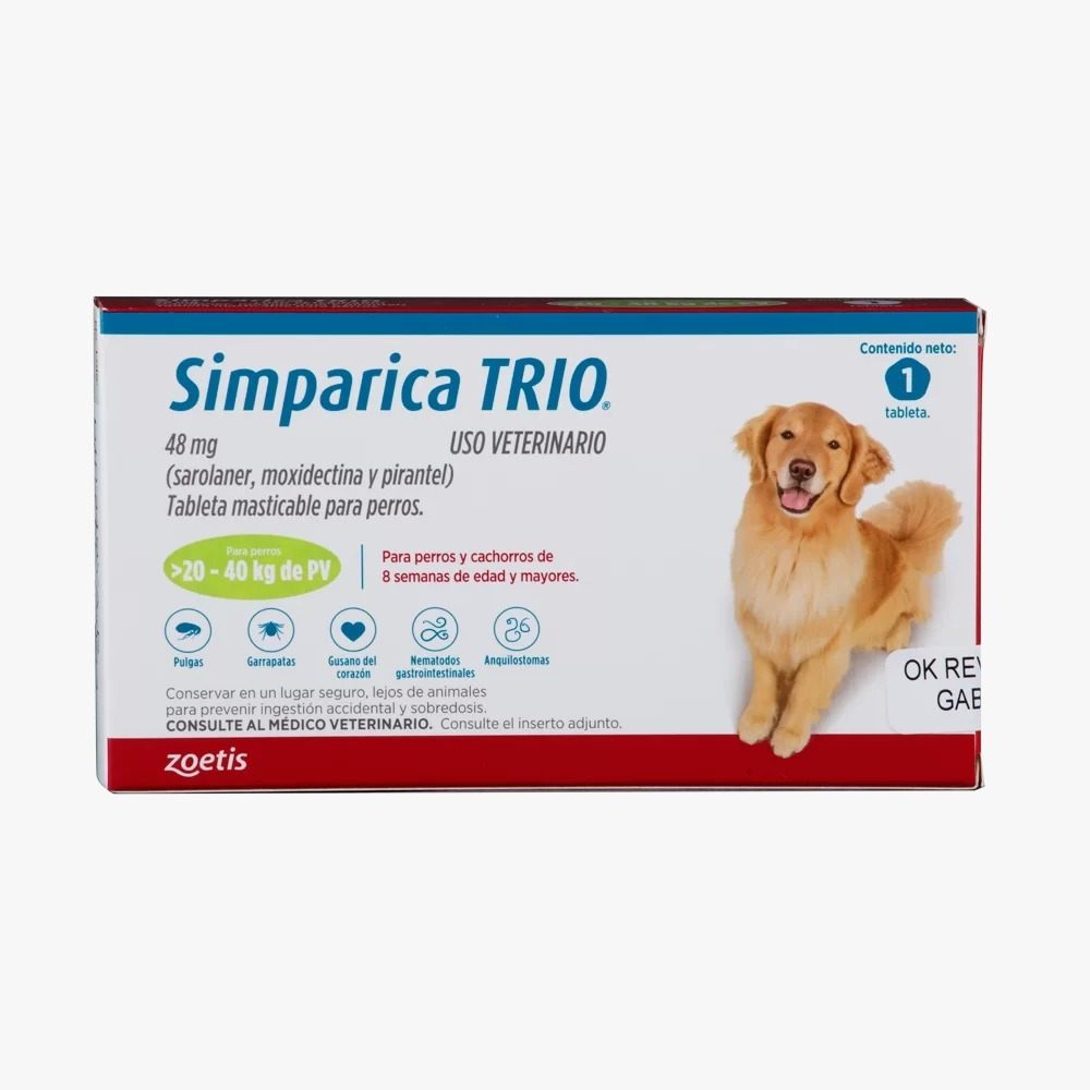 Simparica Trio para perros de 20-40 kg es una tableta masticable de 48 mg con triple acción antiparasitaria. Combate pulgas, garrapatas, ácaros, gusanos intestinales y previene la dirofilariosis. Formulado para razas grandes como Labrador Retriever, Pastor Alemán y Golden Retriever.